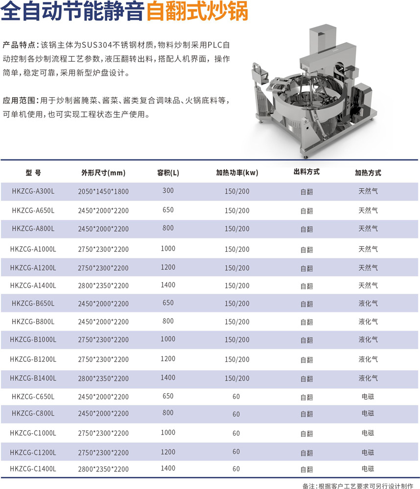 該鍋主體為SUS304不銹鋼材質(zhì),物料炒制采?PLC?動(dòng)控制各炒制流程?藝參數(shù),液壓翻轉(zhuǎn)出料,搭配?機(jī)界?, 操作簡(jiǎn)單,穩(wěn)定可靠,采?新型爐盤設(shè)計(jì)。